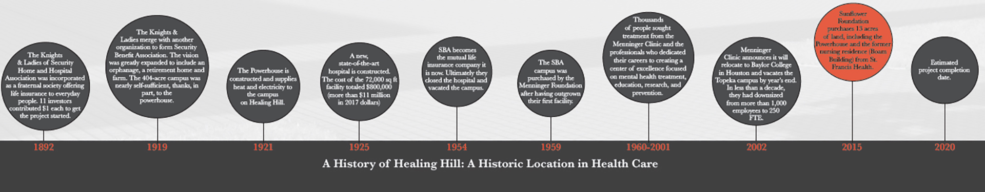 Healing Hill, as it has come known, has a long history of innovative and comprehensive health care that has served not only Kansans, but people from across the country (see A History of Healing Hill: A Historic Location in Health Care below). Though abandoned more than 15 years ago, re-imagining Healing Hill as a collaborative space for learning and innovation is exciting.